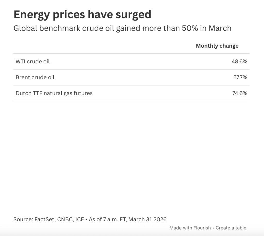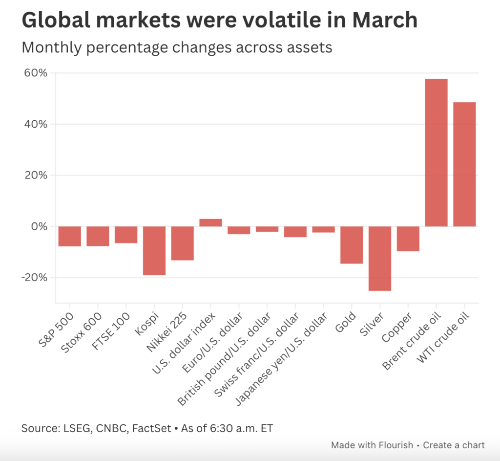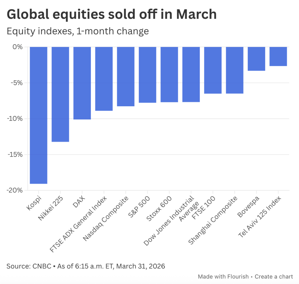 Concerns over the impact of the Iran war on energy prices and inflation have also depressed sentiment in European and Asian markets. These regions are considered to be more dependent on oil and gas imports than the United States, making them more vulnerable to energy shocks. South Korea, for example, recorded a nearly 20% drop in the Kospi index in March, despite being one of the best performing stock markets in 2025. This decline occurred because the country’s economy is highly sensitive to spikes in energy prices.