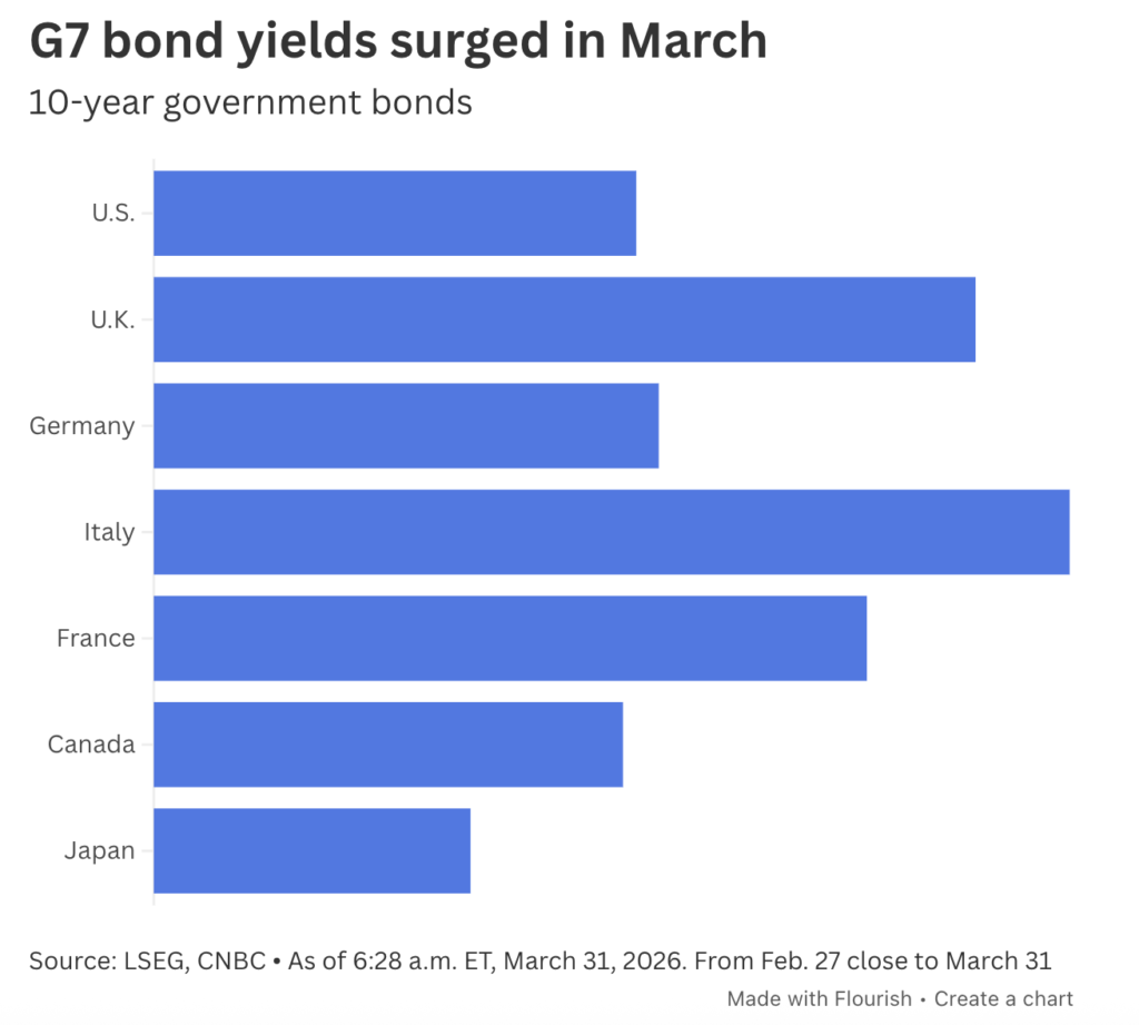 Outside of the stock market, government borrowing costs have also risen amid a large sell-off in sovereign bonds in developed markets. Bond yields, which move in the opposite direction to bond prices, continued to rise throughout March. This rise occurred as investors began to readjust their expectations of possible interest rate hikes by central banks.